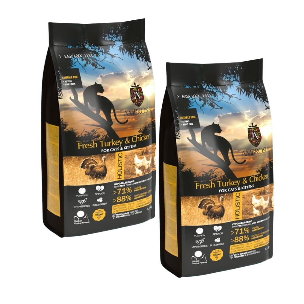 2 שקי אמברוסיה הודו טרי ועוף לחתול בוגר וגור 5 ק"ג (יחד 10 ק"ג)